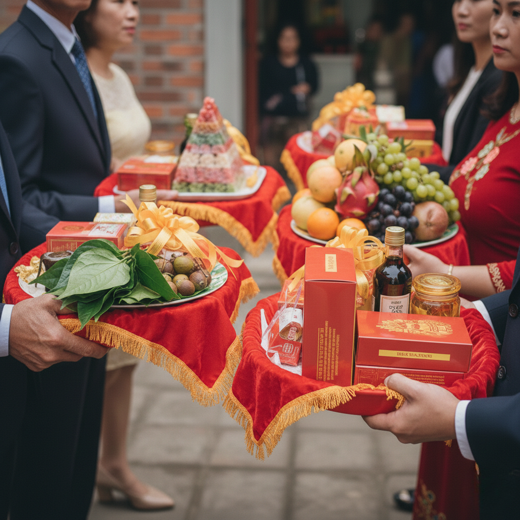Zásnuby ve Vietnamu mají jasně daný průběh. Datum se často vybírá podle lunárního kalendáře, aby bylo považováno za příznivé. Rodina ženicha přichází k rodině nevěsty v předem domluveném počtu. Muži nesou ozdobené podnosy s dary, které mají symbolický význam.